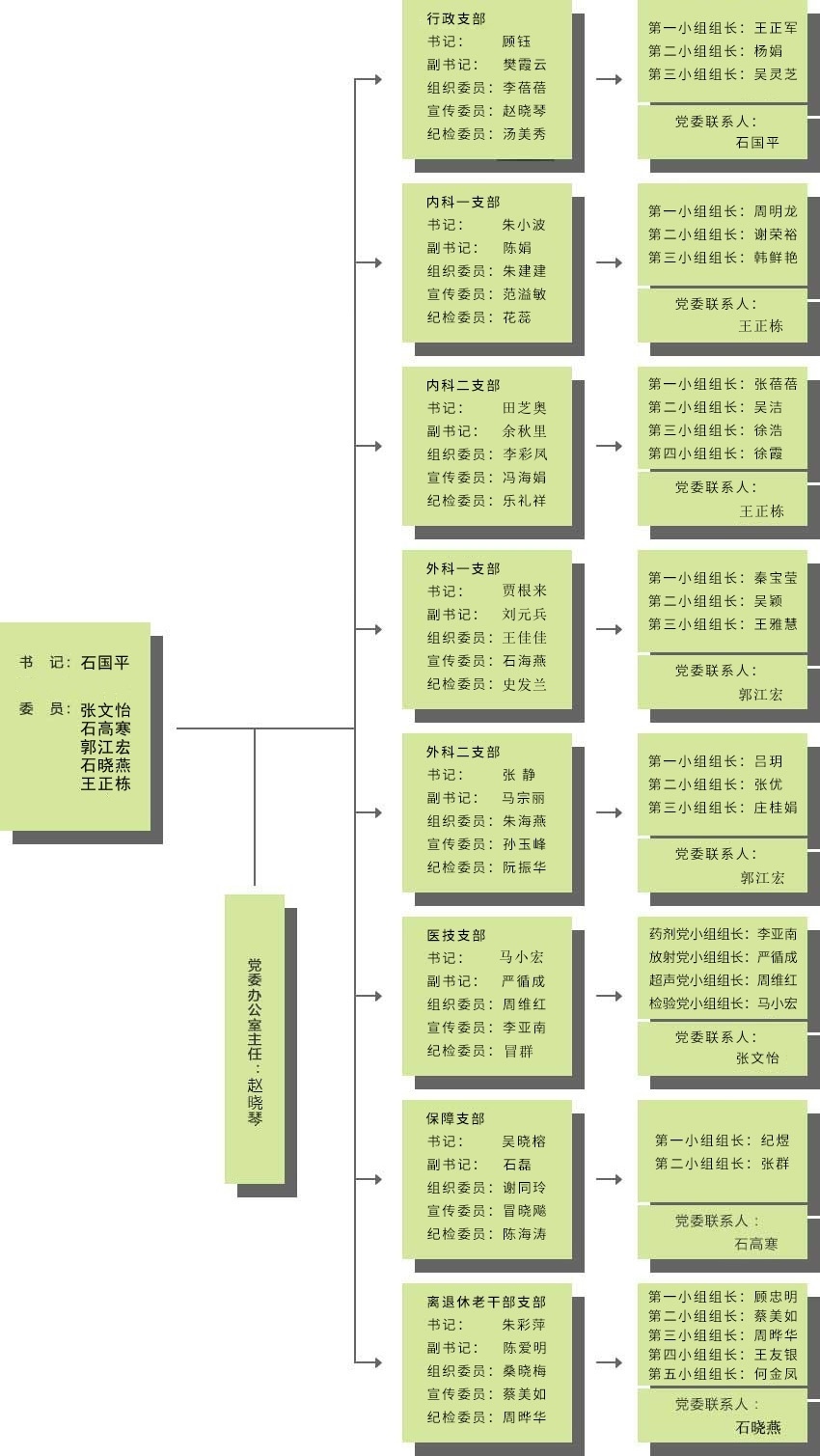 全院共有党员284名,其中在职党员222名,院党委下设党办,设行政、内科一、内科二、外科一、外科二、医技、保障、离退休老干部八个党支部